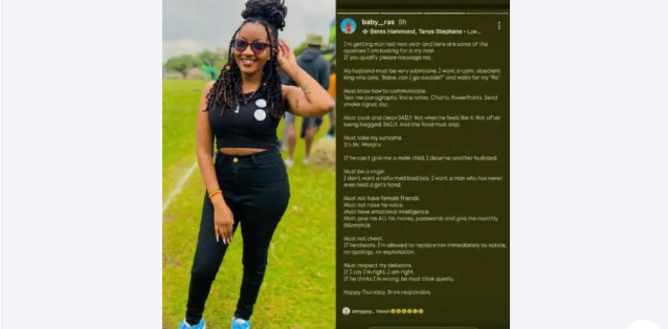 The 29-year-old content creator, whose real name is Mercy Wanjiru, uploaded the tongue-in-cheek yet deadpan list on Wednesday evening with the caption “Applications close 31st December 2025. Serious candidates only.”