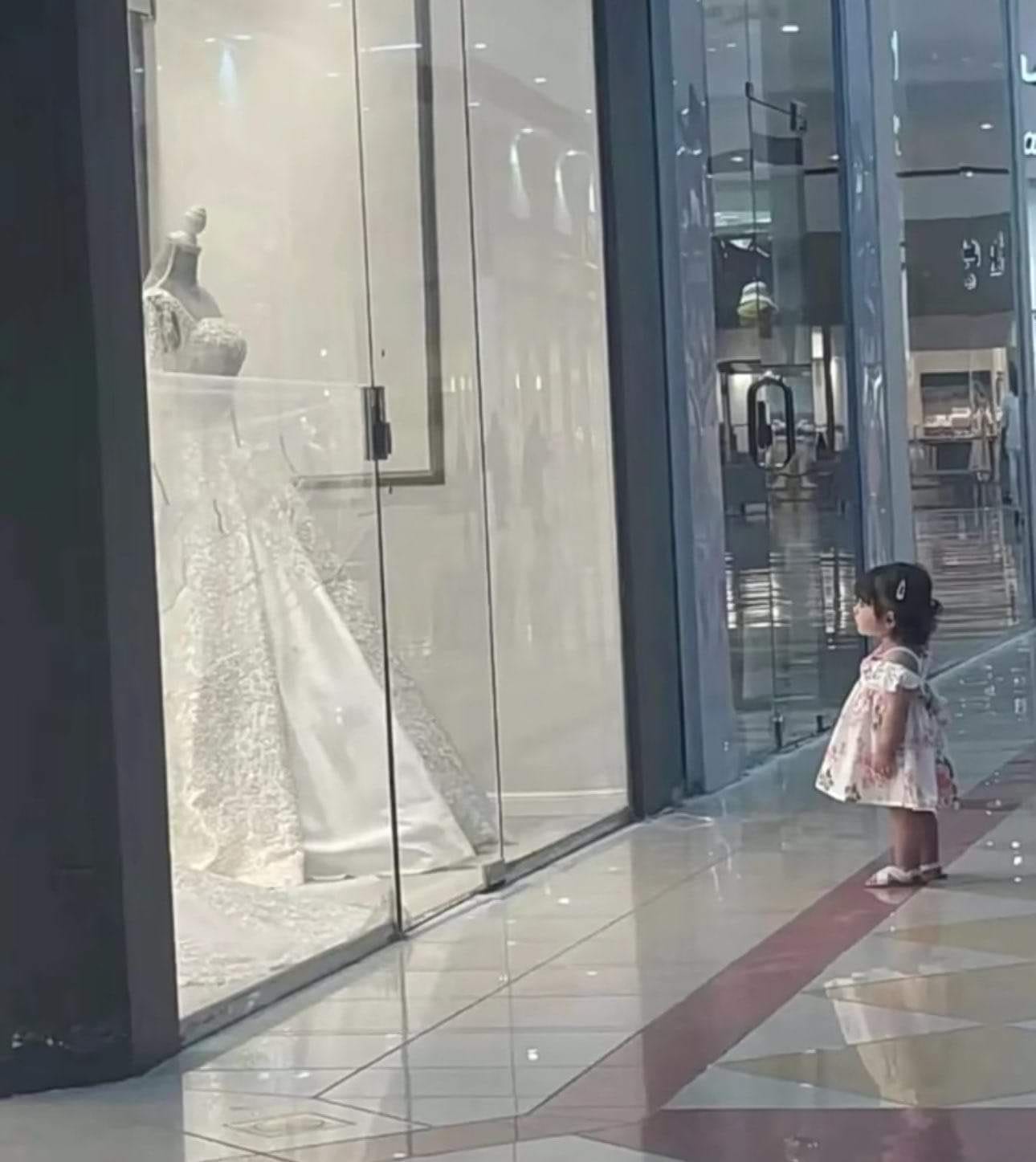 The girl in the photo looks about two or three years old. She stares up at a white gown on display. Eyes wide, small smile. It looks cute to many. The backlash came from feeling it got turned into an unneeded lesson.